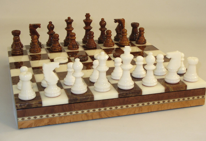 Rich brown tones mix with creamy white colors, each enhanced by the stunning power of pure natural alabaster. This combination results in a chess set that has a refined and sophisticated demeanor, and which will elevate the ambiance of any space it is placed within.
