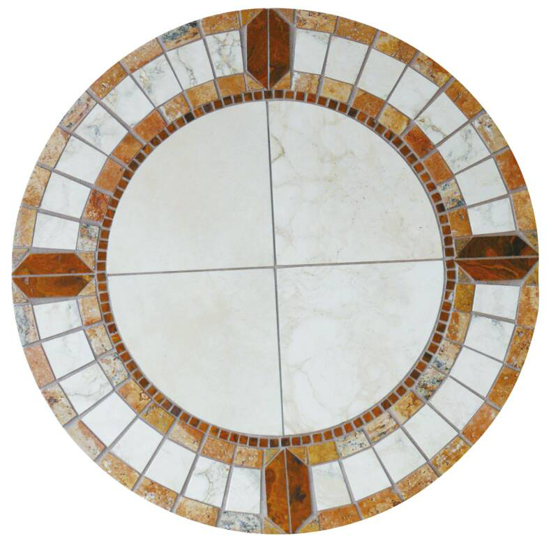 The soft white sowfall of the rich travertine center is bordered by a series of dramatic mosaic pendants, which act like compass points drawing the eye to the four corners of the piece.